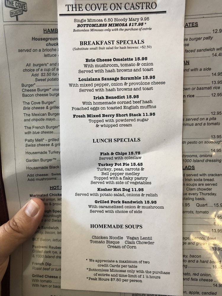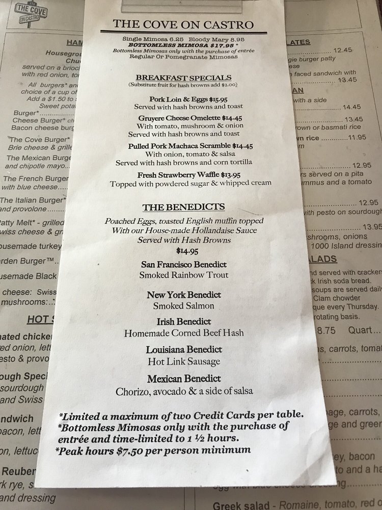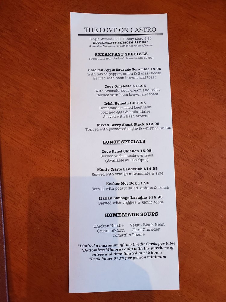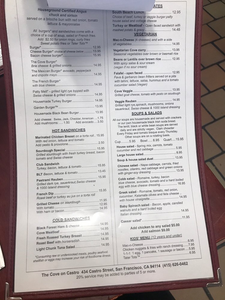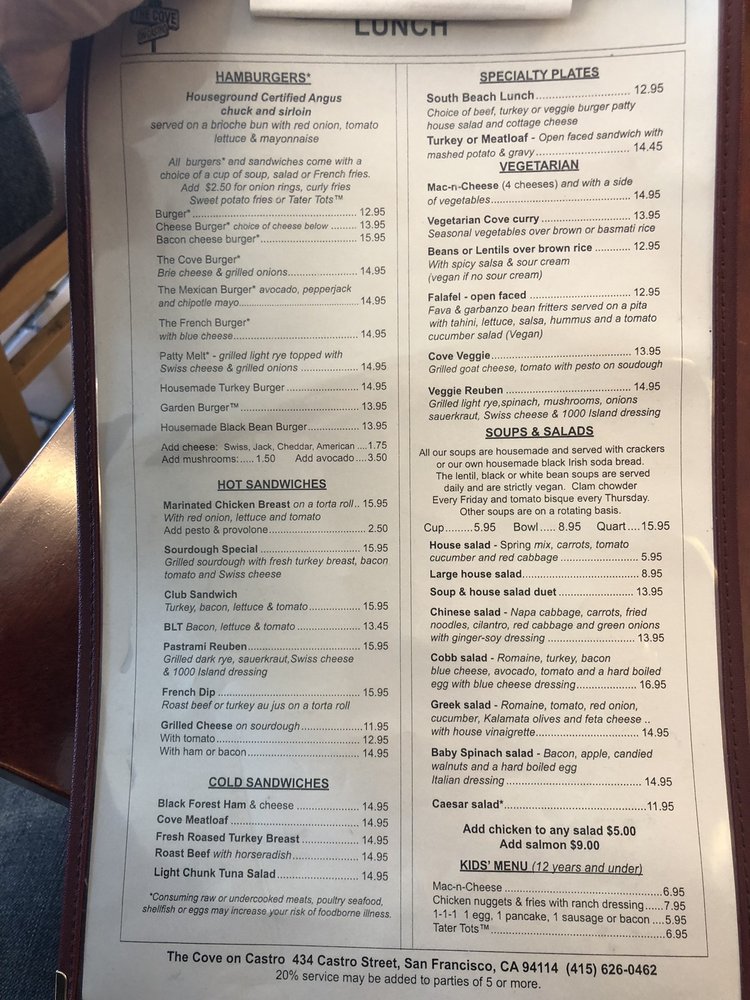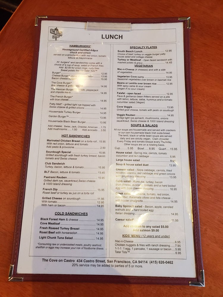 The Cove on Castro Cafe, located in San Francisco, is a charming American diner that offers a variety of vegetarian and vegan options. This women-owned establishment prides itself on its casual atmosphere, making it a great spot for groups and families. With features like outdoor seating, free Wi-Fi, and gender-neutral restrooms, The Cove on Castro Cafe has everything you need for a comfortable dining experience. The menu boasts delicious breakfast and brunch options, along with beer and wine selections. Whether you're looking for a hearty meal or a light snack, this cafe has something for everyone. Don't forget to take advantage of their delivery and catering services for a taste of The Cove on Castro Cafe at home.